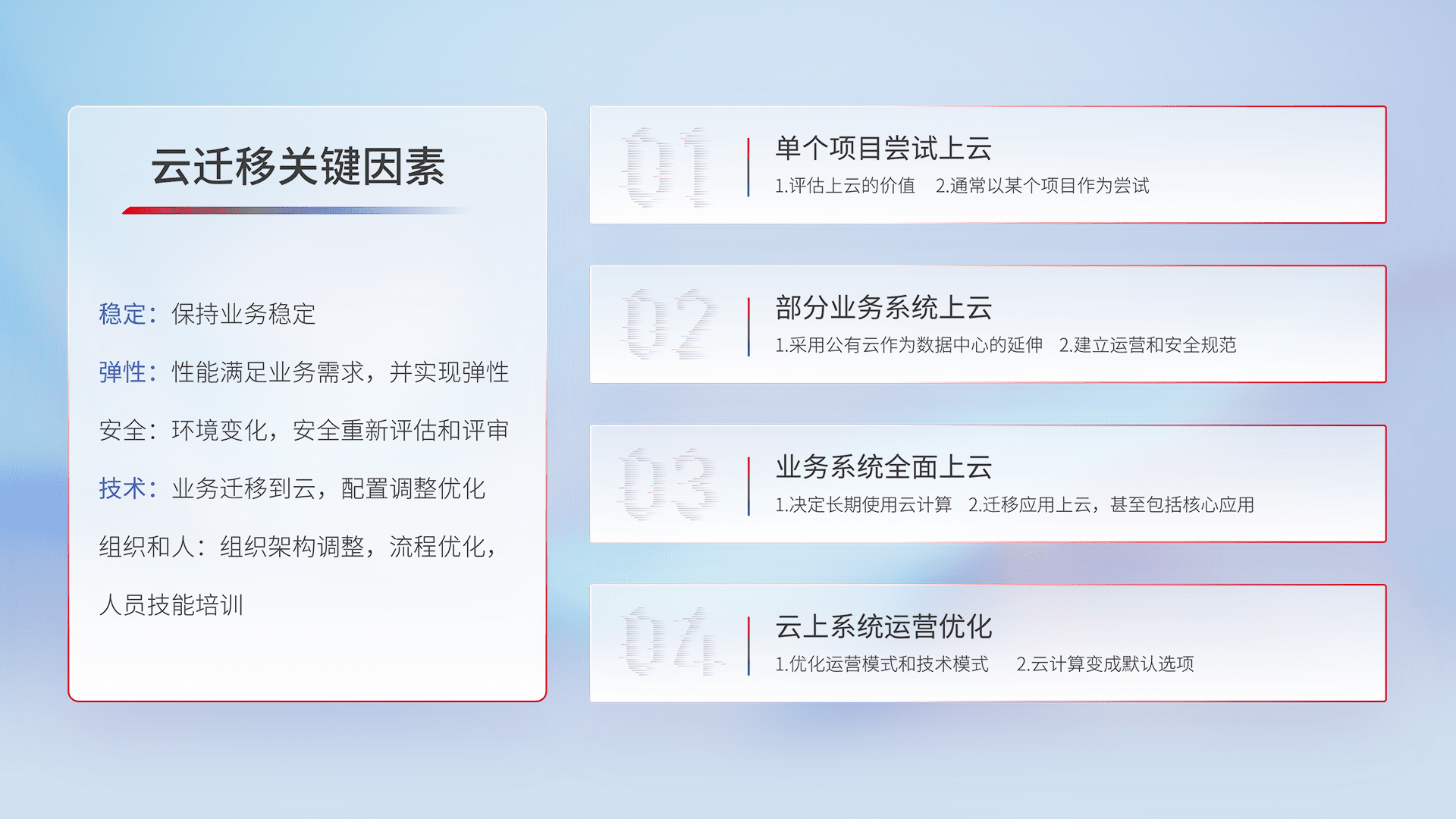 结合实际业务,,,,从规划设计、、云平台选型、、、、云原生改造、、、数据迁移、、集成交付,,,,迁移全过程为客户识别最佳上云路径,,,做好风险识别管理,,,,设计网络架构、、身份权限、、、、安全审计合规、、、、操作审计、、日志审计、、、、监控告警策略、、、、多站点容灾设计等,,,,对云上基础设施进行整体规划,,提升IT治理水平,,,,以满足弹性、、、高可用、、、、高性能的需求。。。。