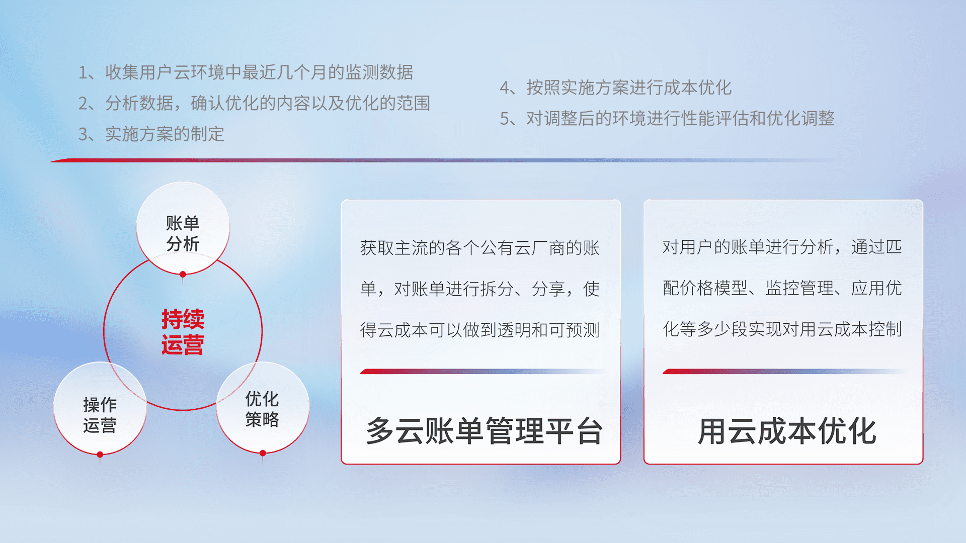 通过多云纳管,,以统一的资源数据模型把客户的云资源进行抽象和封装,,进而实现对多云资源的统一操作,,,保障云资源管理的可靠性、、稳定性与可用性。。。。量身定制化运维内容,,配置、、、、开发运维、、、、补丁管理、、、备份、、监控、、、、认证和访问管理、、审计和日常巡检等,,,保障在用云过程中的可靠度,,稳定度以及高可用率。。